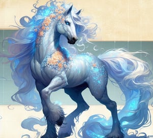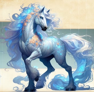 Væsen: Albastru Beskrivelse: Albastru er et majestætisk væsen, der ligner en hest, men med en skinnende pels, der skifter farve som opalsten. Dens manke og hale er fyldt med blomster, der blomstrer i takt med årstiderne, og dens øjne glimter som daggryets første lys. Albastru er kendt for sin forbindelse til naturens magi og kan kun tæmmes af de reneste af hjerte.